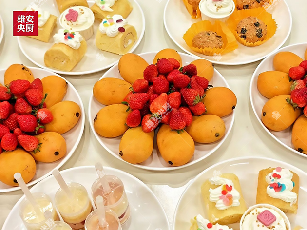 活動現場,雄安央廚的團隊成員們早早地布置好了場地,鮮花、甜點、水果和飲品一一擺放整齊,營造出溫馨而浪漫的氛圍。